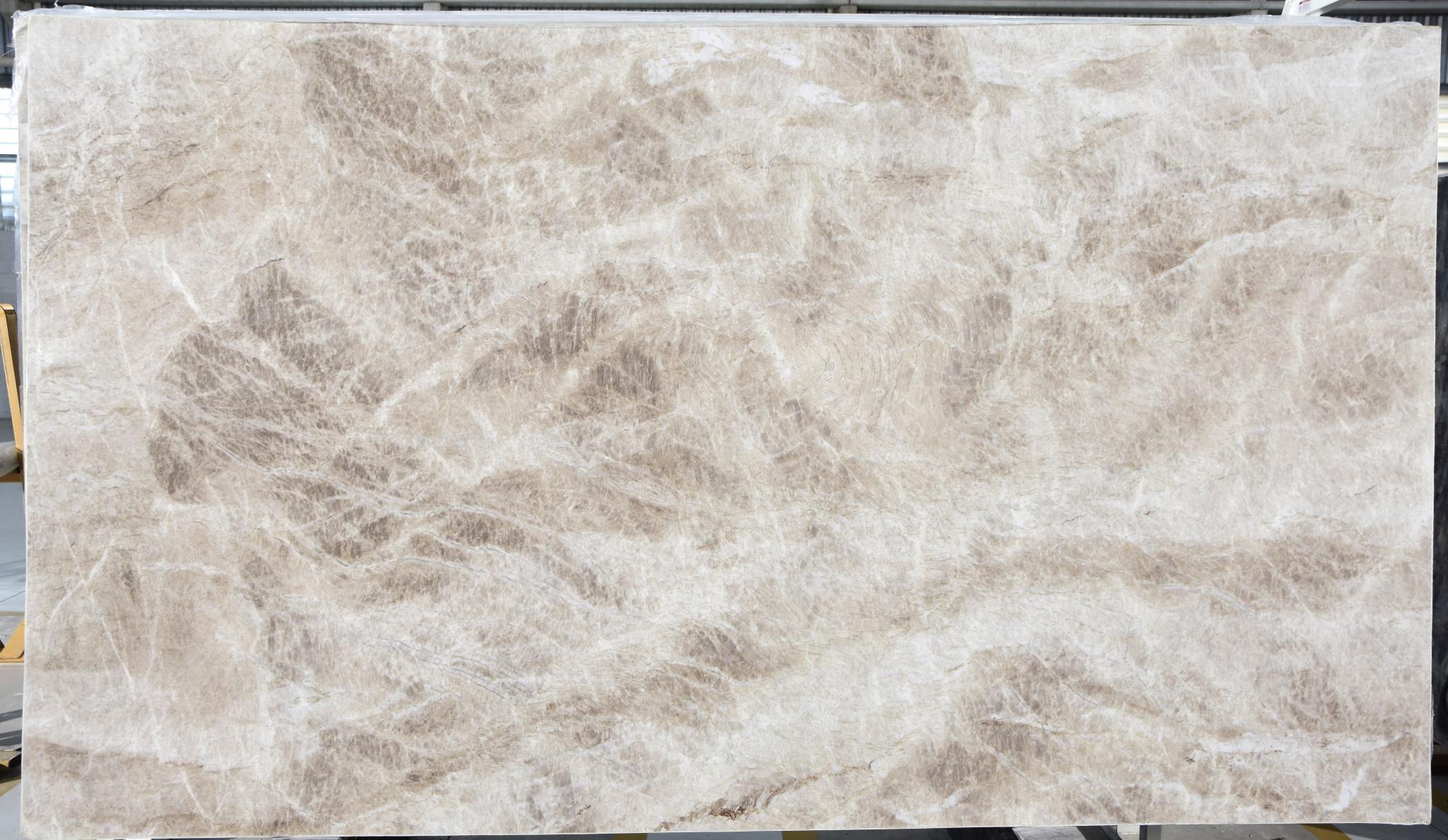 • Subtle Veining: The movement across the slab is gentle, featuring translucent veins and wispy patterns in muted tones of light gold, pale taupe, and soft gray. The movement is organic and refined, avoiding harsh contrasts.